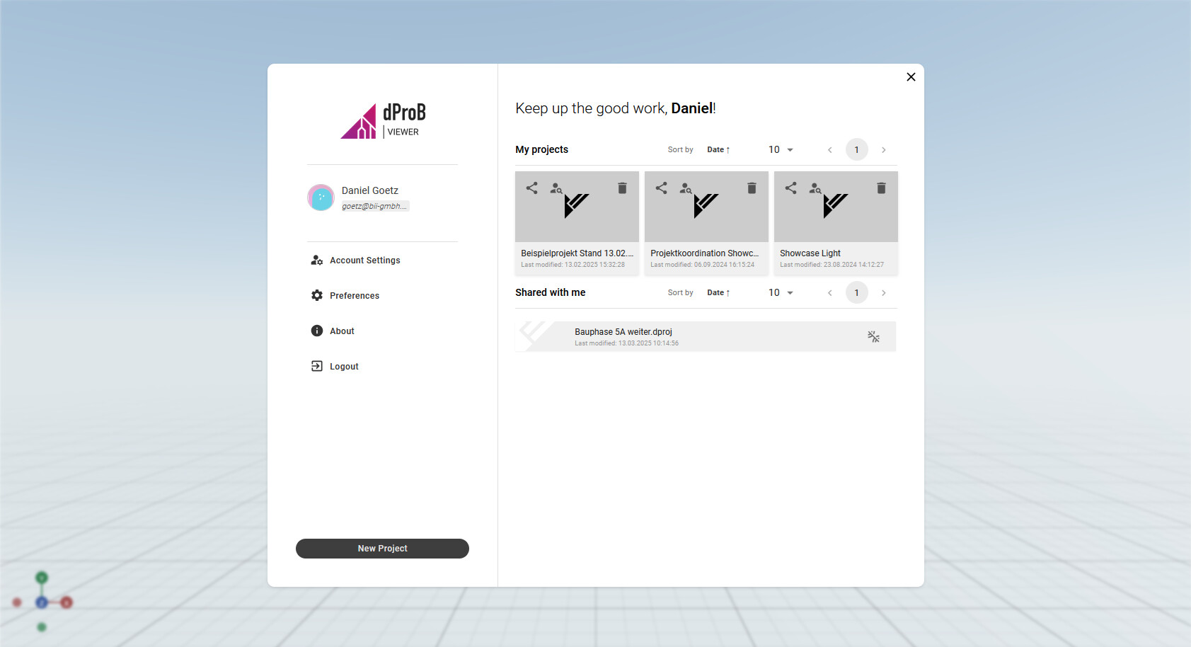 Um loszulegen, könnt ihr Projekte ab Version 2025.1 direkt über das Programm-Menü in den dProB Viewer exportieren. Dort lassen sie sich anschließend per E-Mail-Adresse mit jedem registrierten Nutzer teilen.