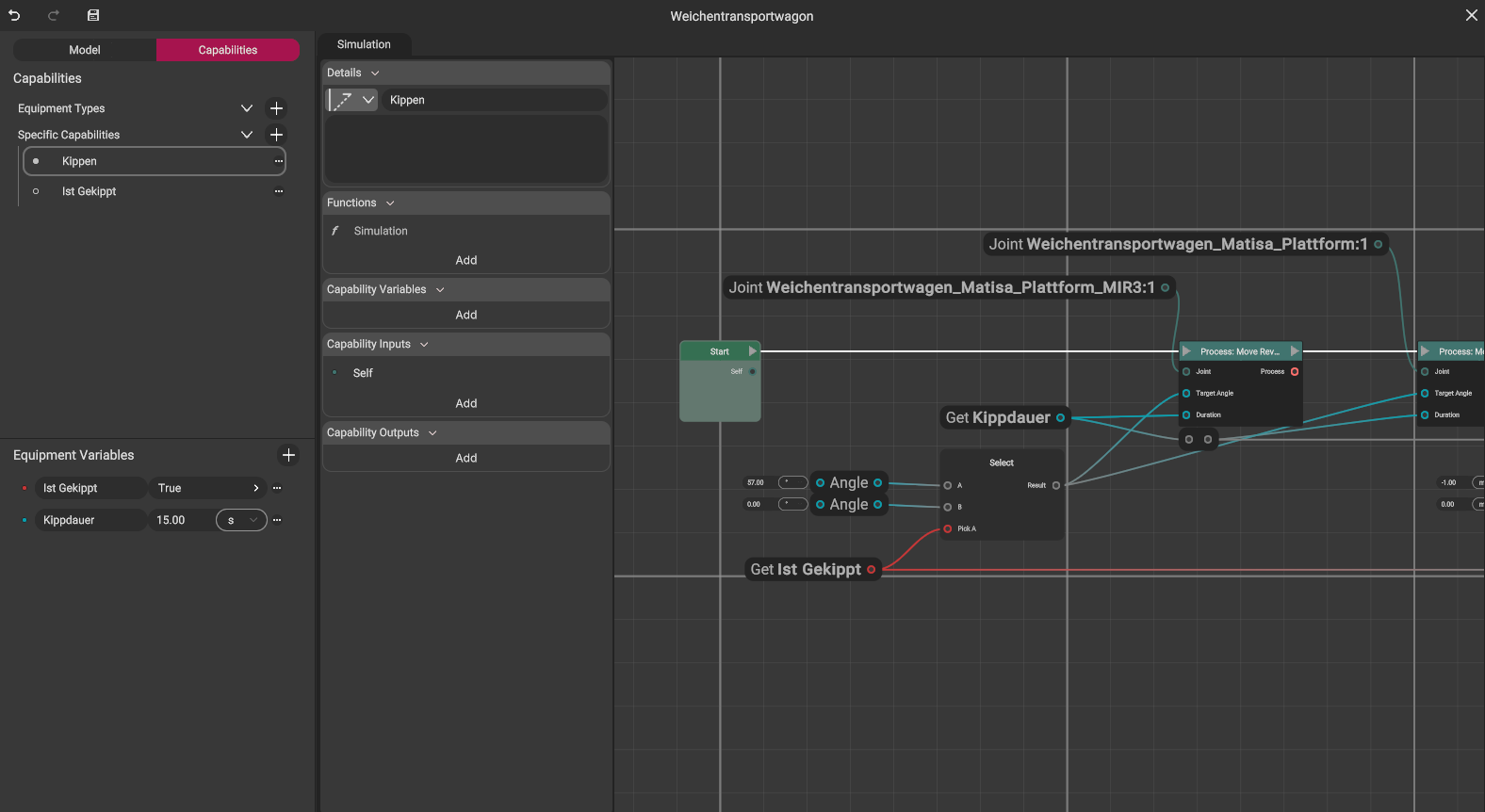 Im Fähigkeits-Tab scriptet ihr Geräteprozesse per Template. Dank der Gerätevariablen lassen sich Gerätezustände wie ein- oder ausgefahrene Stützen dynamisch abbilden.