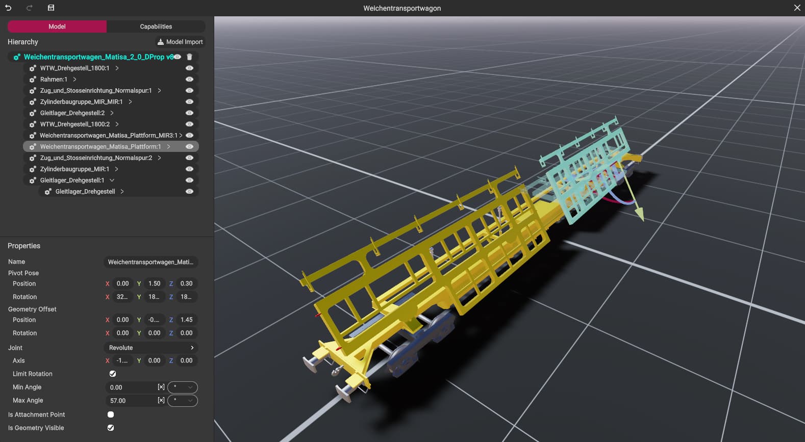 Im Model-Tab könnt ihr 3D-Modelle importieren, platzieren und mit Gelenken versehen. Anders als im alten Gerätekonfigurator sind hier auch Pivot-Anpassungen möglich.