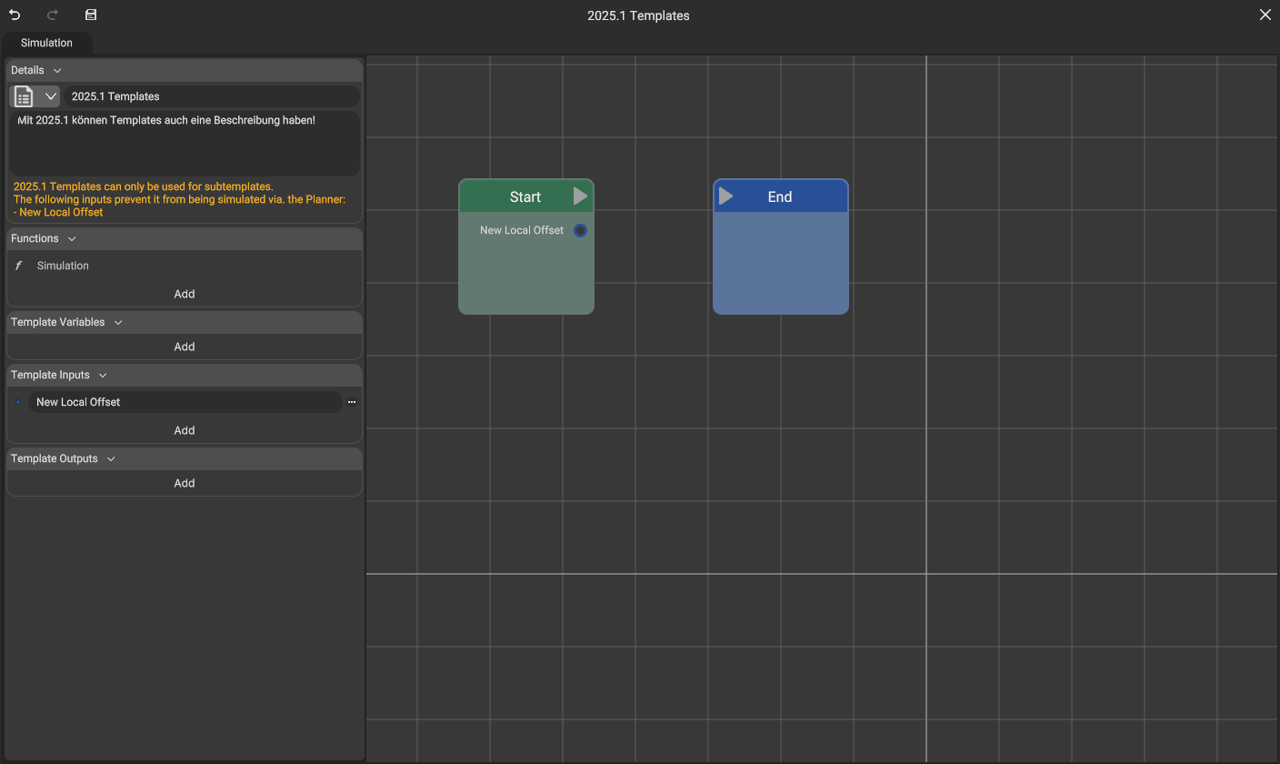 - Ihr könnt jetzt nicht-simulierbare Templates erstellen. Diese beinhalten Inputs, die nicht vom Nutzer geplant werden können, und dienen als Hilfsbausteine für wiederkehrende Logik. Beim Erstellen erscheint eine Warnung, die auf die nicht planbaren Inputs hinweist.